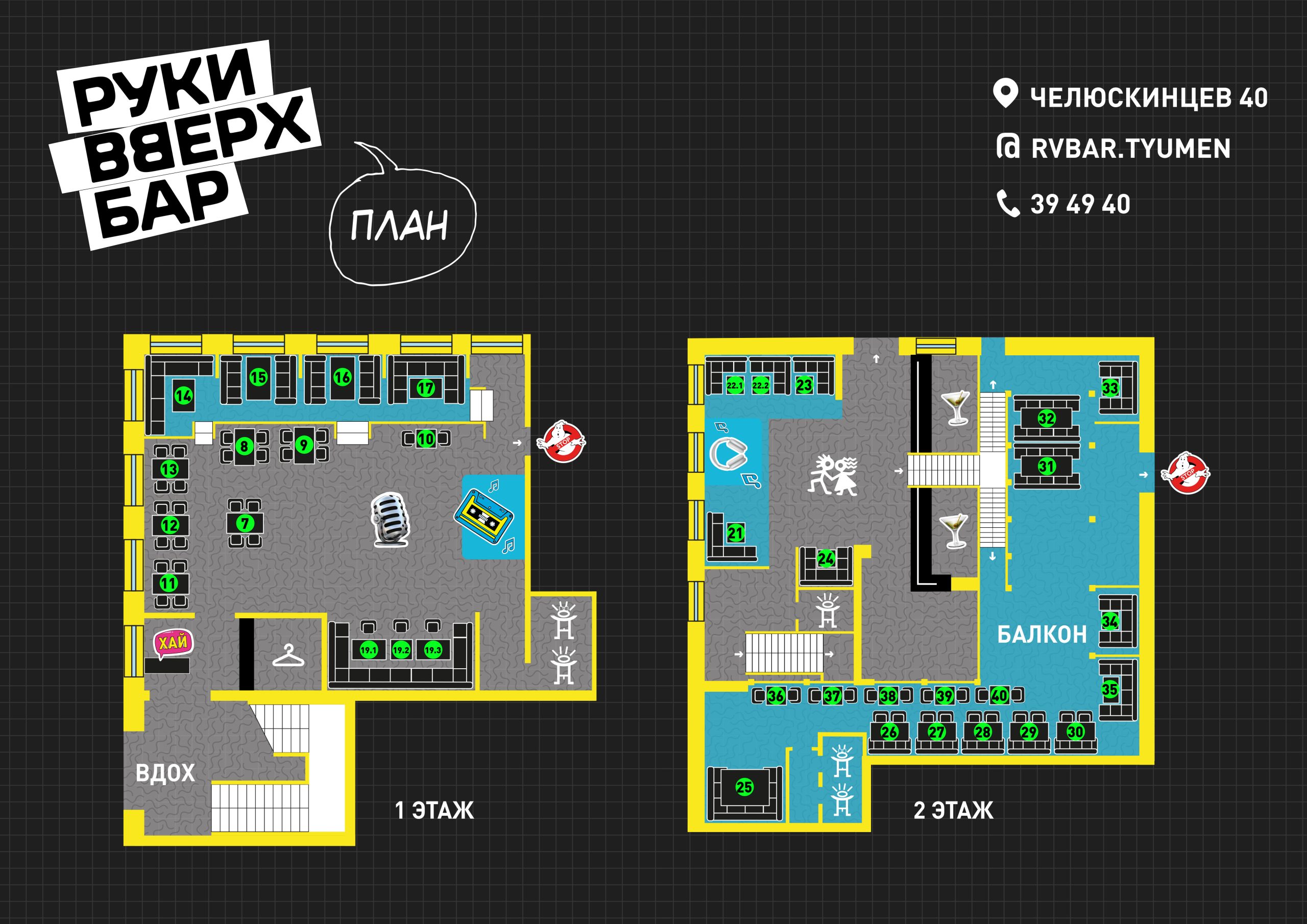 Бронь столов танцпол: до 21:00 — бесплатно, с 21:00 — депозит (тратится на меню кухни и бара) 1500р с человека